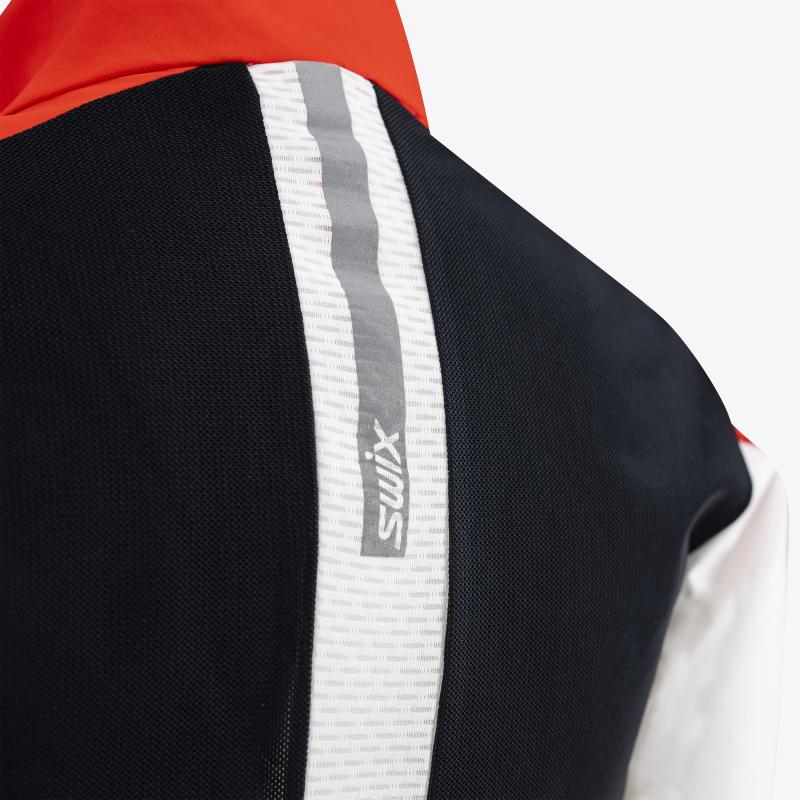 Vindavvisende treningsjakke til dame. Designet for rulleski og løping langs landeveien. Jakken har synlige farger med refleksdetaljer for ekstra synlighet. Materialet er stretchy og pustende for maksimal komfort og mobilitet under trening. En brystlomme med glidelås holder telefonen på plass.