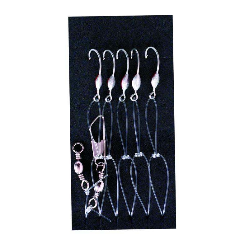 Dette heklet er ferdig montert og klart til bruk, med fem klassiske tyttebærkroker som egner seg godt til agn som rekebiter, makrellstrimler eller børstemark. Den kraftige sena og korte total lengde gir god kontroll under vertikalt fiske fra båt.