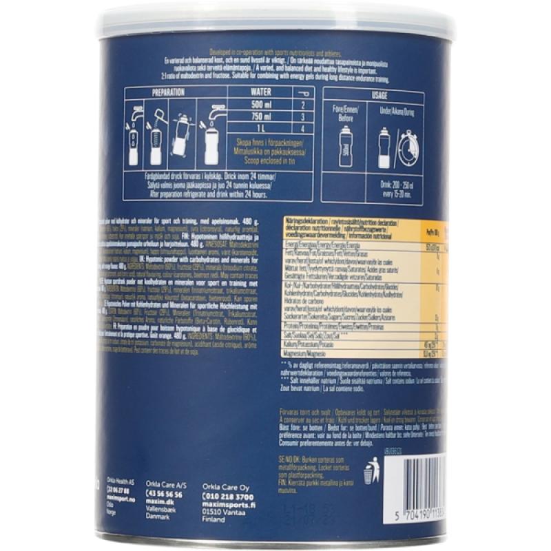 Maxim Sportsdrikke er et hypotonisk pulver med karbohydrater og mineraler for sport og trening. Denne boksen inneholder 480g pulver, tilsvarende 6 liter ferdigblandet sportsdrikke. Den naturlige appelsinsmaken er frisk og god å drikke uten å være for søt. Inneholder nødvendige salter og karbohydrater, som gir best mulig forutsetning for prestasjon under trening og konkurranser.En perfekt sportsdrikk for deg som skal på for eksempel løpetur, sykkeltur, langrennstur, eller som skal delta i renn, ritt og løp.Sånn blander du ut 750ml Maxim Sportsdrikke til vår store drikkeflaske:1. Fyll flasken omtrent halvveis med friskt, kaldt vann.2. Hell oppi 3 scoops med pulver. Praktisk måleskje følger med boksen!3. Skru igjen lokket og rist drikkeflasken til pulveret er løst opp.4. Åpne korken og fyll på med vann til flasken er full.5. Du er klar for en skikkelig utholdenhetsøkt!Når man trener skal man drikke i en slik hastighet at det man mister av salter og vann erstattes – for dehydrering vil påvirke prestasjonen din negativt i konkurranser og under treningsøkter. Vi anbefaler at du drikker 200-250ml sportsdrikke hvert 15. til 20. minutt gjennom hele økten. Regelmessig væskeinntak av Maxim Energy Drink gir musklene nødvendig energi og sikrer hydrering.Sportsdrikken inneholder ca. 900 mg natrium per liter, samtidig som den også er tilsatt kalium og magnesium.I denne sportsdrikken har vi brukt to karbohydratkilder (glukose og fruktose) med en ratio på 2:1. Denne kombinasjonen gjør det mulig for tarmen å ta opp 90 gram per time, samt at kroppen vil kunne yte mer på lengre økter – fordi det er mer karbohydrater tilgjengelig per time.